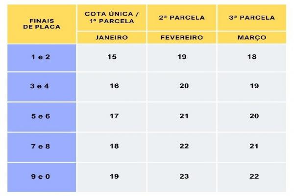 A escala de pagamentos da primeira parcela ou cota única começa em 15/1/2024 para os veículos com finais de placas 1 e 2, e termina em 22/3/2024 para a quitação da terceira parcela dos veículos com finais de placas 9 e 0. Veja abaixo a tabela.