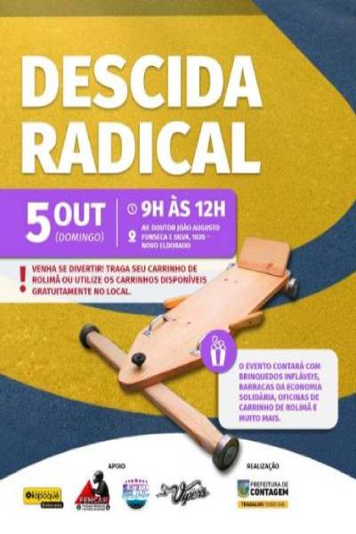 O evento “Descida Radical” do próximo domingo (5/10), das 9h às 12h, em Contagem, promete diversão gratuita para todas as idades no bairro Novo Eldorado, com carrinhos de rolimã, brincadeiras e atrações culturais.