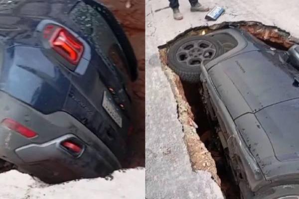 Um carro modelo Jeep Renegade foi "engolido" por uma cratera que se abriu no asfalto da Rua Coronel Lauro Pires, no bairro Pedra Azul, em Contagem, na tarde desta segunda-feira (9).